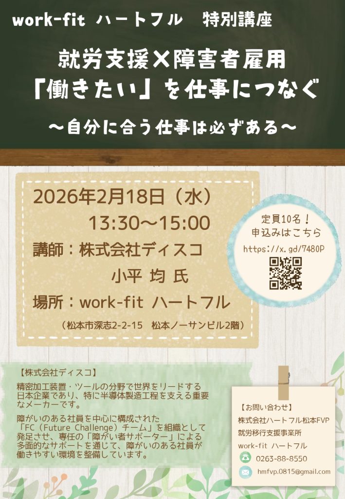 このたびwork-fitハートフルにて、特別講座を開催いたします。